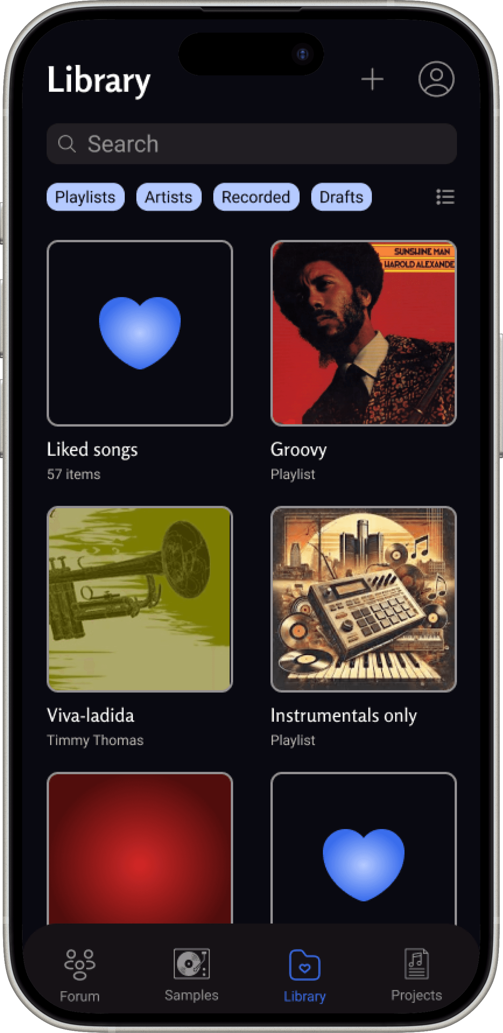 The Library stores all your saved samples and sounds, organizing them into playlists by genre, mood, or inspiration for easy access.